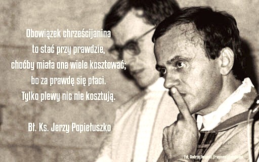 Ksiądz Jerzy, Alfons Popiełuszko, ur. 14 września 1947 we wsi Okopy – wiosce położonej na Białostocczyźnie, niedaleko Suchowoli. Jerzy był jednym z pięciorga dzieci Władysława i Marianny Popiełuszko, którzy zajmowali się gospodarstwem rolnym. Jego mała siostra Jadwiga zmarła po powikłaniach ospy w wieku 2 lata. Jerzy był typem samotnika, uczył się dobrze. Od dzieciństwa wyróżniał się głęboką religijnością, oraz służył do Mszy. Po maturze w 1965 roku wstępuje do Wyższego Seminarium Duchownego w Warszawie. Na początku drugiego roku studiów został przymusowo wcielony do wojska. W latach 1966 – 68 odbył zasadniczą służbę wojskową w specjalnej jednostce dla kleryków w Bartoszycach. Jerzy Popiełuszko wyróżniał się odwagą w obronie swoich katolickich przekonań, co umacniało w wierze pozostałych kleryków. Po powrocie z wojska u kleryka Jerzego zaczęły się poważne problemy ze zdrowiem. Chorował na złośliwą anemię i często przebywał w szpitalu. 28 maja 1972 r. przyjął święcenia kapłańskie z rąk ks. Kardynała Stefana Wyszyńskiego. Na obrazku prymicyjnym zapisał znamienne motto: „Posyła mnie Bóg, abym głosił Ewangelię i leczył rany zbolałych serc”. Ks. Jerzy pełnił posługę kapłańską w parafiach: p.w. Św. Trójcy w Ząbkach i p.w. Matki Bożej Królowej Polski w Aninie oraz p.w. Dzieciątka Jezus na Żoliborzu. W posłudze duszpasterskiej szczególnie upodobał sobie pracę z dziećmi i młodzieżą. Niestety kłopoty ze zdrowiem nasiliły się…..